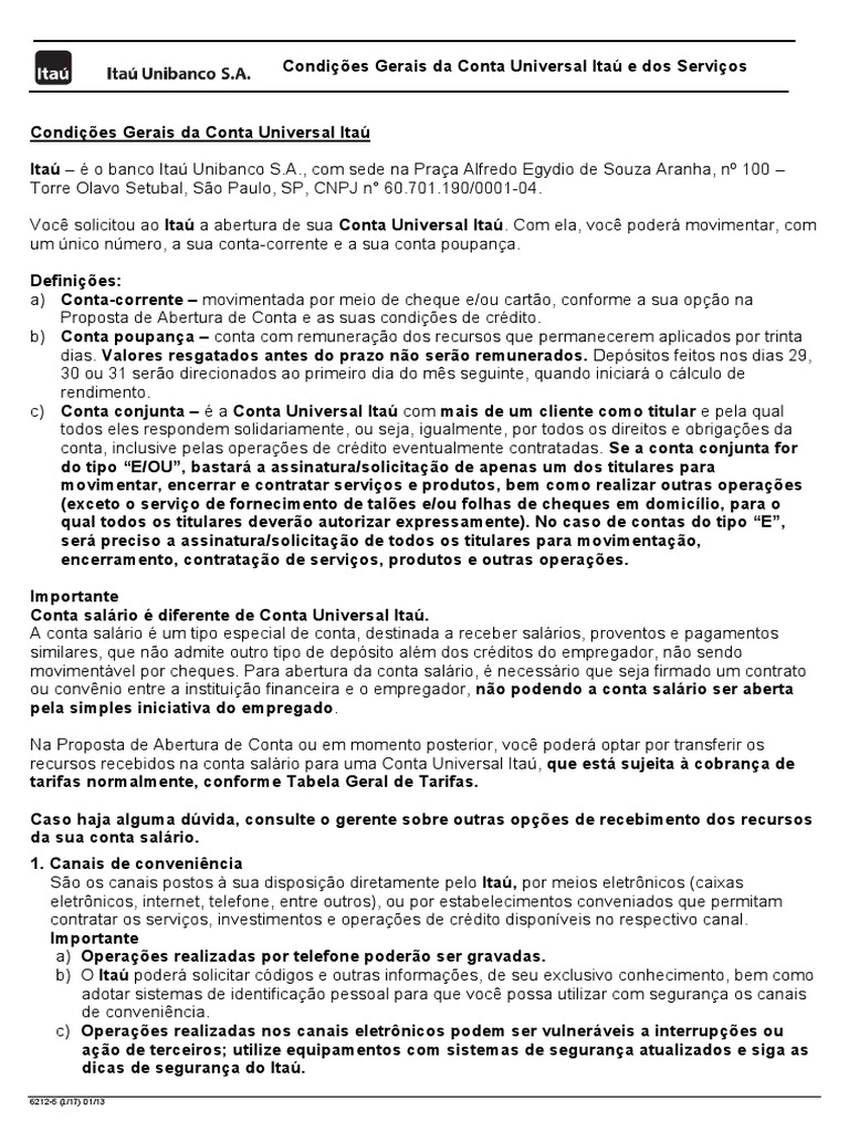 Condicoes Gerais Da Conta Universal Itau Dos Servicos Jan13 Conta De Transacao Comprovante De Deposito